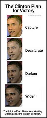 Yes, it is what it appears to be. There may be evidence that some members of the Clinton campaign may have manipulated photos of Barak Obama in order to make him appear darker. One has to wonder who thought this was a good representation of the Illionis senator? But accuracy is not the intent with the final two pictures, is it?